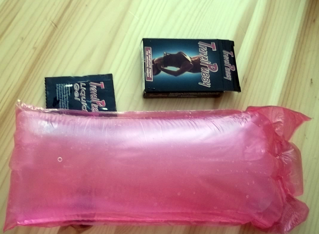 Tegelijkertijd kwamen mijn reisgenoot en ik weer bij de poortjes aan. Meteen liet hij mij, ietwat rood aangelopen, een foto op zijn telefoon zien. Op de herenafdeling was ook een toevoeging gedaan aan de standaard wc-architectuur van de wegrestaurantketen. Daar hing een automaat aan de muur waaruit je een travelpussy kon trekken. De kleine zwarte doosjes met een afbeelding van een wulps uitziende dame op de voorkant bevatten iets wat leek op een roze boterhamzakje, dat je kon vullen met (warm) water, en twee zakjes glijmiddel. Zodra je het zakje vulde met water bleef er een uitsparing over waar precies een piemel in paste. Het glijmiddel spoot je in de uitsparing en dan kon je los.